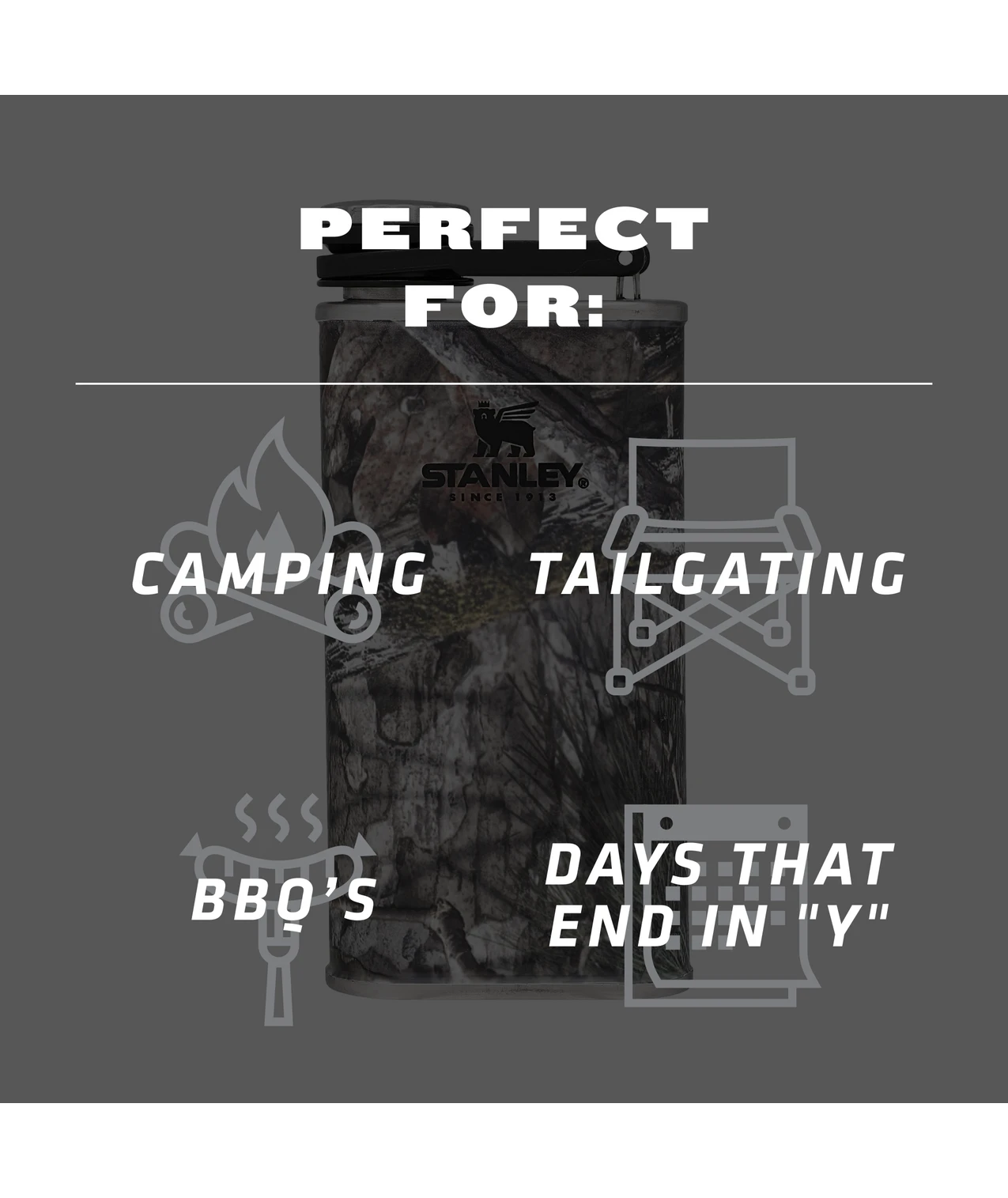 After a long day in your hunting blind or fishing boat, it’s time to celebrate. Stanley and Mossy Oak® have you covered with the “Camo Flask” in classic Mossy Oak® print. Constructed of durable stainless steel, the portable size is made for slipping into a pack or pocket, and the wide mouth makes for easy filling. No funnel needed. Last but not least, there’s a never-lose cap.